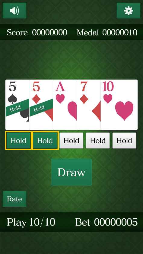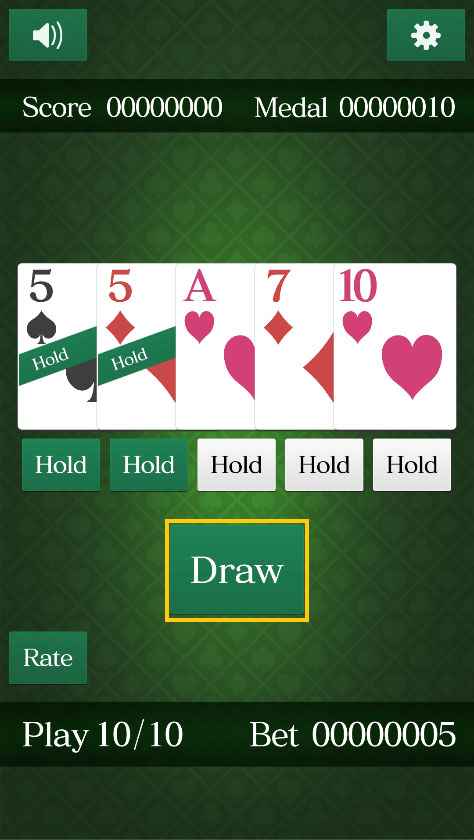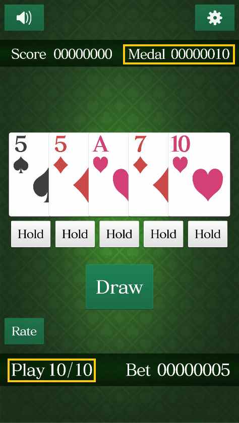 ポーカーを行い、10Playでどこまでスコアを伸ばせるかを競うゲームです。