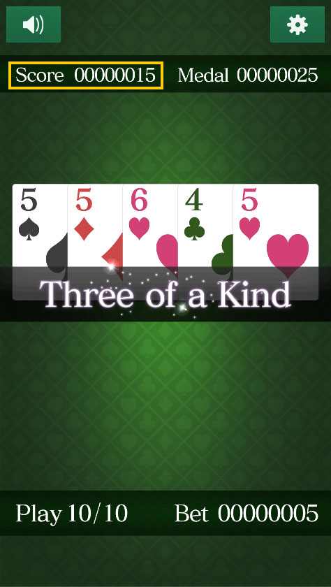 手持ちのMedalからBetするMedal数を選択しポーカーを行い、役に対して獲得したMedalの枚数がScoreとなります。